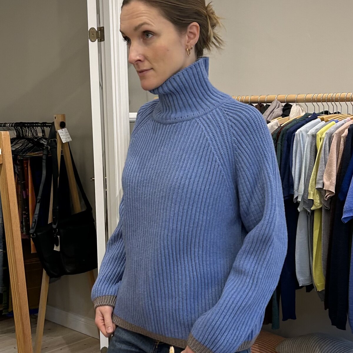 Dansk designet kraftig patentstrikket sweater med en fremhævet raglan. Ærmer og krop afsluttes i en rib. Kraven er designet til at stå, men kan også foldes ned. Kraven er ikke tætsiddende. Der er lagt en ‘tubolare’ ind mellem sweater og krave, som giver en smuk overgang. Farven er mellemblå meleret. Kanter forneden på ærmer og krop i mørk beige.
